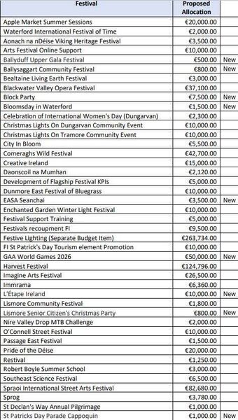 Winterval (€350,466), Harvest Festival (€124,796), Spraoi (€82,680) and Waterford Music Generation (€80,000) stand out as some of the most heavily-funded festivals.